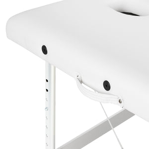 The height of the table can be adjusted to the height and individual needs of the person performing the treatment using a telescopic adjustment from 62 to 80 cm with a locking mechanism. Each of the table's aluminum legs consists of two tubes that can be freely moved relative to each other after being unlocked. The Fast Lock mechanism holds the elements in the selected position once the lock is placed in the appropriate hole. Additionally, the frame structure is stabilized with metal cables, which makes the massage table solid and perfect for a wide range of services.