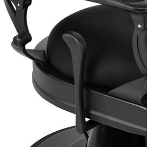 A solid base construction ensures stability and high comfort of use. The seat filling made of durable, deformation-resistant foam and the upholstery made of pleasant-to-touch synthetic leather with a matte finish ensure long-term durability and comfortable use of the furniture. The materials used also make the equipment moisture-resistant, durable, and easy to clean. The cover in shades of black along with the decorated footrest, gives it a unique character. The chair, with its distinctive design referencing vintage style, fits perfectly into the atmosphere of barbershops, enhancing their unique ambiance.