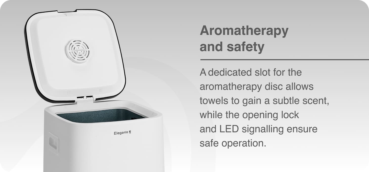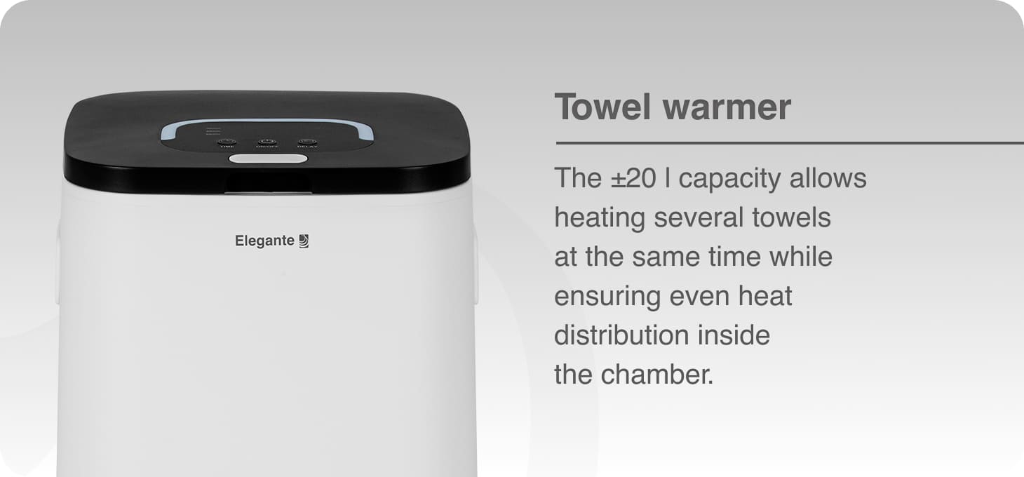 With a capacity of ± 20 litres, the elegant Elegante E3 towel warmer ensures that several large towels can be heated at the same time. The bucket-shaped design ensures even heat distribution during each cycle. For greater ease of use, it is equipped with a display, handles on the sides, hooks for the interior and a holder for a fragrance disc.