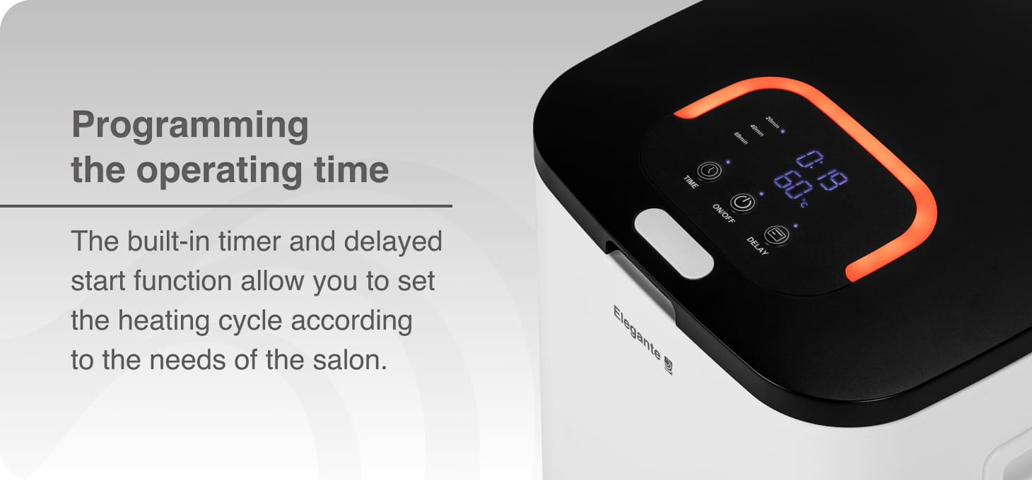 The appliance heats up quickly so that it is ready for use in no time. The heater has a timer function, allowing you to set the operating time for: 20, 40 or 60 minutes, after which the heating stops. The clear display counts down the remaining time and indicates the temperature inside the appliance. The delayed start function allows you to schedule the start-up - the setting can be adjusted in 30-minute increments up to a maximum of 24 hours. Once the delay time has elapsed, the appliance starts heating according to the set time.