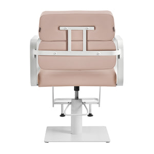 The full rotation mechanism of the chair makes the hairdresser's work more effective and comfortable. A solid, flat, square-shaped base guarantees stability during use. The matte-finished, smooth surface gives the element an elegant look and makes it easy to keep clean. A comfortable seat with foam filling ensures high comfort of use, even during many hours of treatments. Geometric, metal armrests allow for the correct positioning of the client's shoulders – this means that he does not bury his head in his shoulders or slouch – which makes it much easier to perform precise treatments, including haircuts. A stylish footrest dedicated to this model provides stable support for the user's feet.