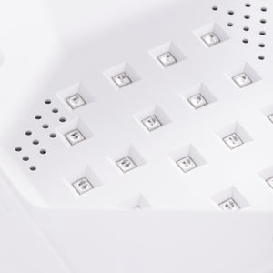 The lamp housing is made of durable plastic and combines a modern, minimalist design with practical application. The lamp is easy to clean, resistant to damage and has dimensions that allow for comfortable positioning of the entire hand or foot, ensuring quick and even curing of the styling. The removable magnetic bottom facilitates pedicures as well as cleaning and disinfecting the device, increasing comfort and hygiene in the salon.