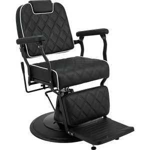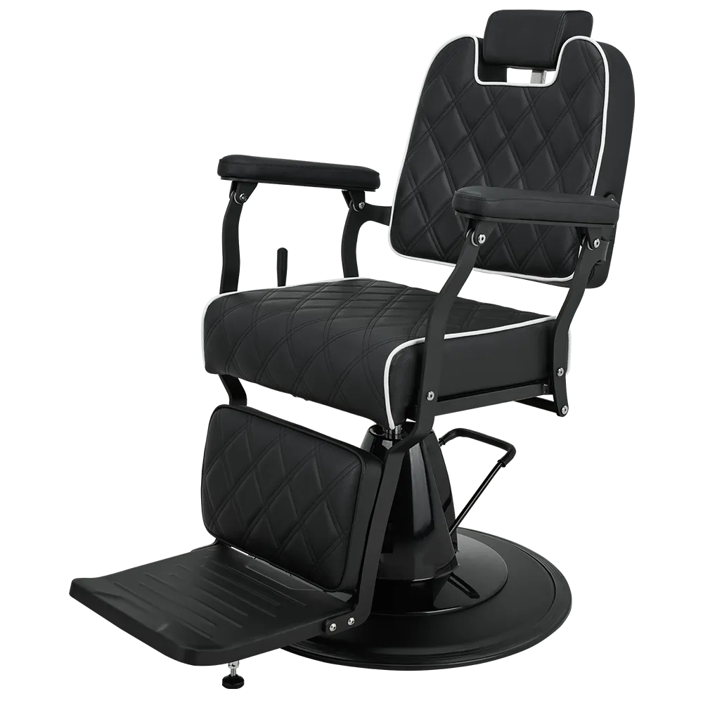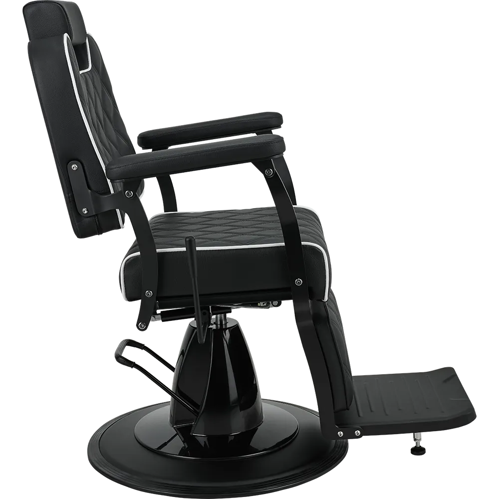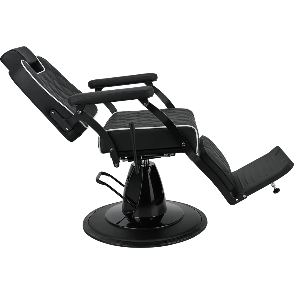 BRAVO barber chair Elegance in a minimalist spirit. A lightweight metal frame combined with black upholstery featuring geometric stitching and contrasting piping. Equipped with an adjustable backrest and a comfortable footrest, this chair ensures comfort for both the client and the barber. A great choice for modern barber and hair salons. Black upholstery