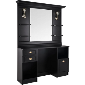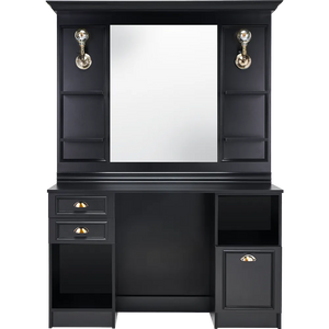 Equipped with shelves for cosmetics, an open and closed cabinet and drawers