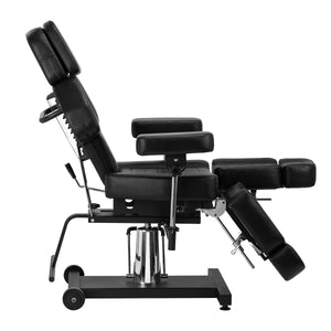 The seat height is adjustable by means of a hydraulic cylinder between 56 and 76 cm, and reaches 210 cm when fully extended. The angle of the backrest and footrests can be adjusted manually. The divisible footrest allows independent positioning of the legs, which significantly increases comfort during treatments and offers more possibilities - in addition, it can be adjusted laterally. Another advantage is that the footrest can be extended, which guarantees stable support even for taller users. The armrests are easily removable and offer a wide range of height and positioning adjustments. All of these solutions ensure a high level of comfort, customer convenience and complete adaptation to the specifics of tattoo studio work.