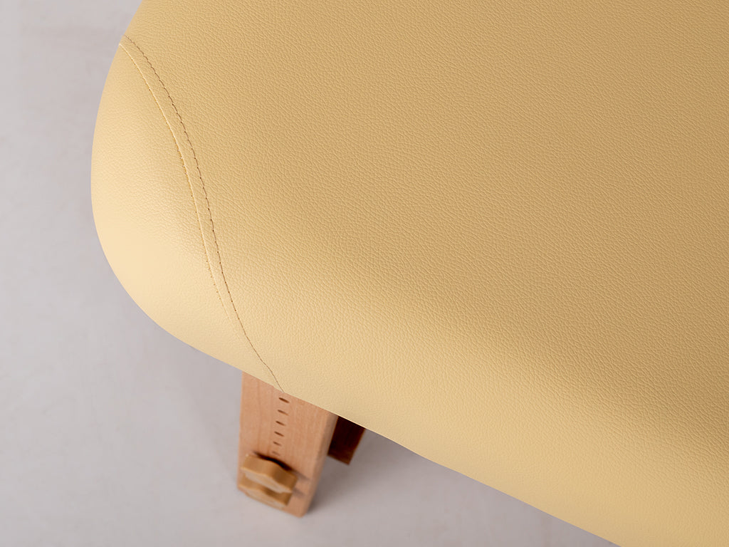 The double-breaking tabletop allows the patient to be positioned in the most comfortable position, depending on the type of treatment performed. The bed, filled with 6 cm foam and covered with pleasant-to-touch upholstery, provides the patient with complete comfort and allows for free body positioning. The functional shelf under the bed provides additional space for accessories and cosmetics needed during the treatment. The natural wood base elements add great aesthetic value to the couch.