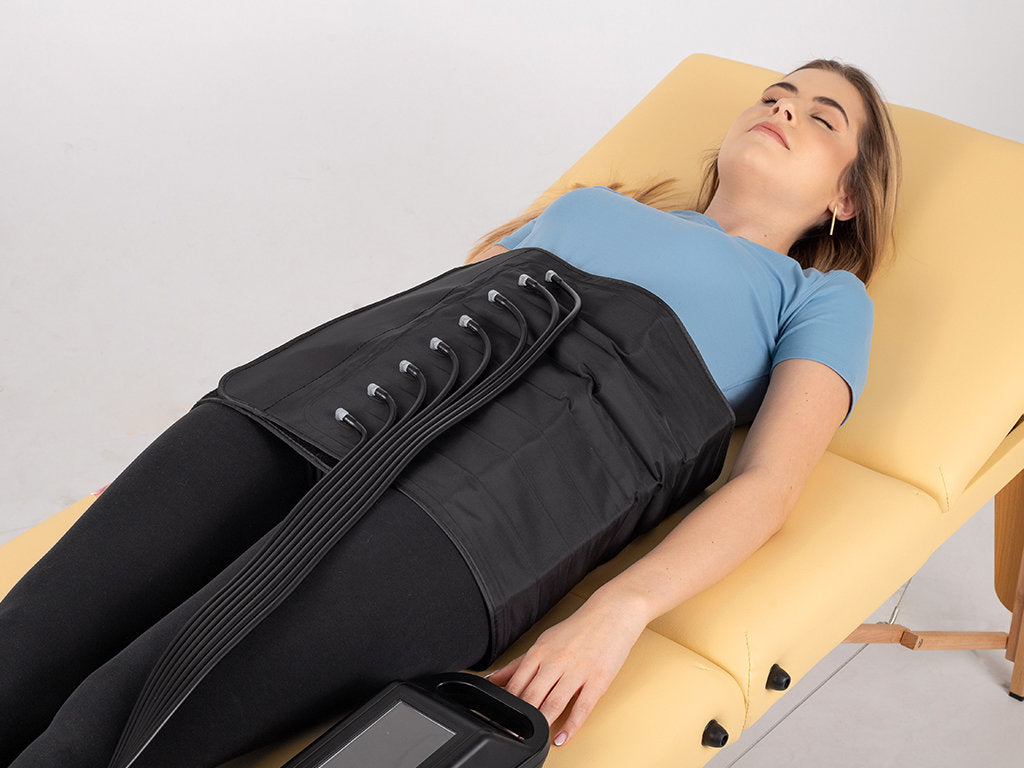 Manchette de drainage lymphatique à 8 chambres avec tuyaux d'air, dédiée aux appareils de la marque Habys : Standard 8, Pro 8. Conçue pour des traitements complets au niveau des hanches et de l'abdomen. Les manchettes sont de taille universelle. Lorsqu'elles sont remplies d'air, elles s'adaptent au corps.