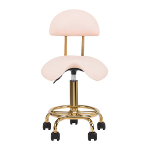 La base à cinq branches dans les tons dorés est équipée de roulettes qui assurent une mobilité importante, facilitant le déplacement du meuble dans le cabinet. Le revêtement du tabouret est en similicuir agréable au toucher dans les tons roses. Grâce à l'utilisation de ce matériau, le tabouret est durable, résistant à l'humidité et facile à nettoyer.