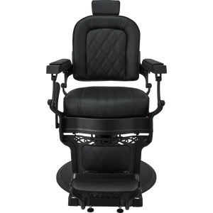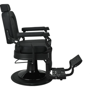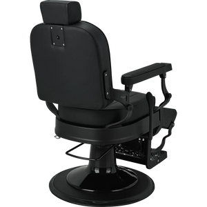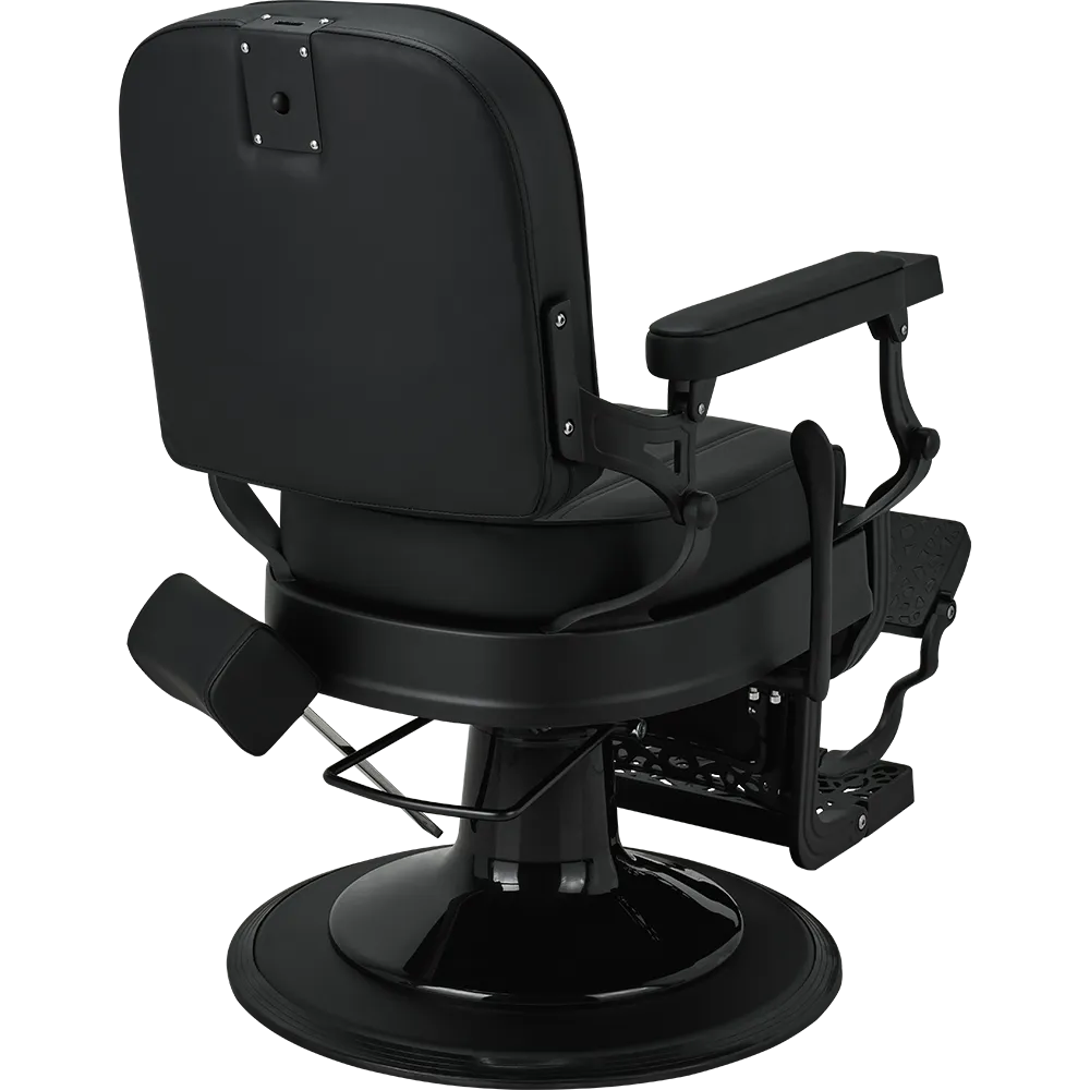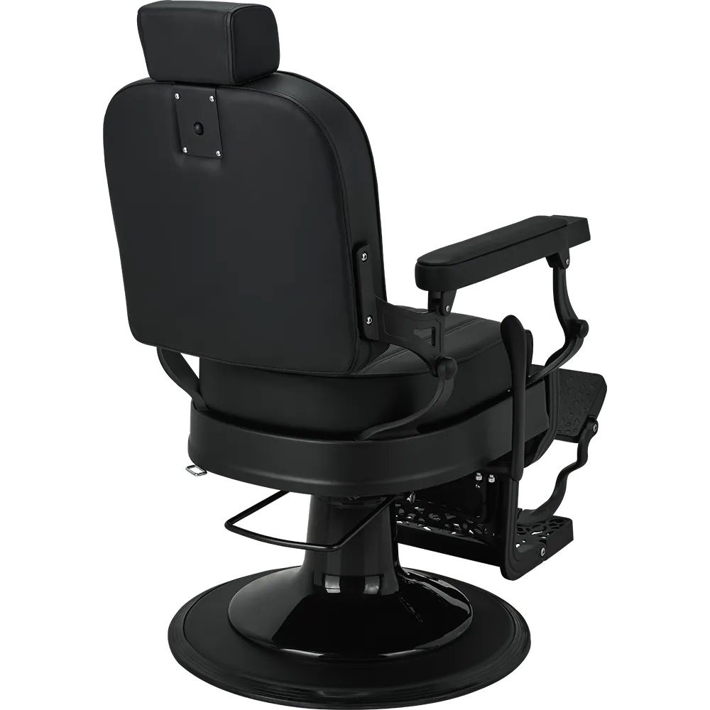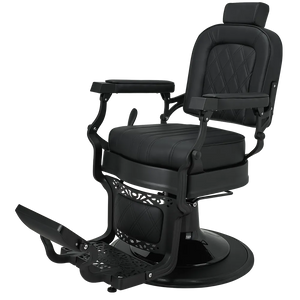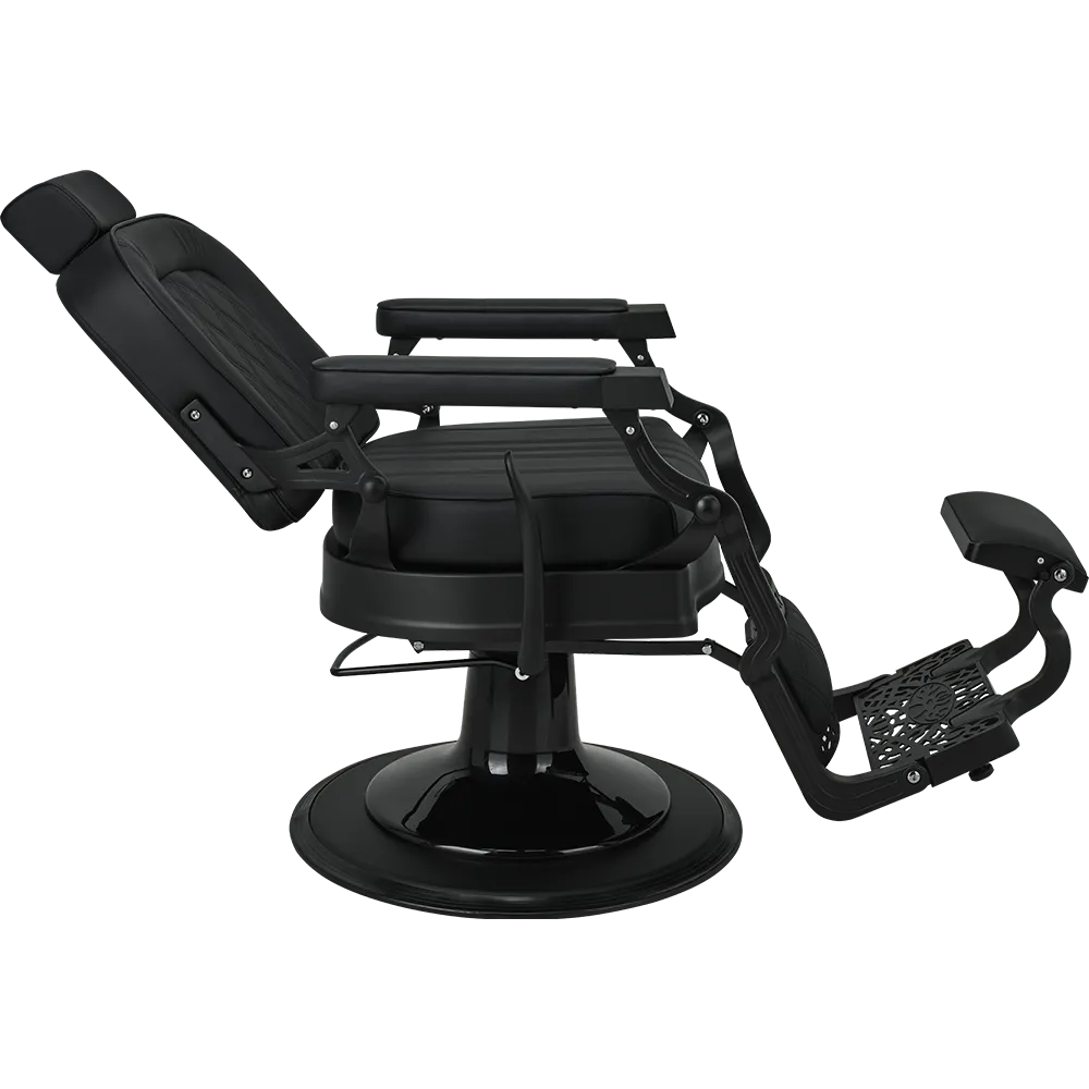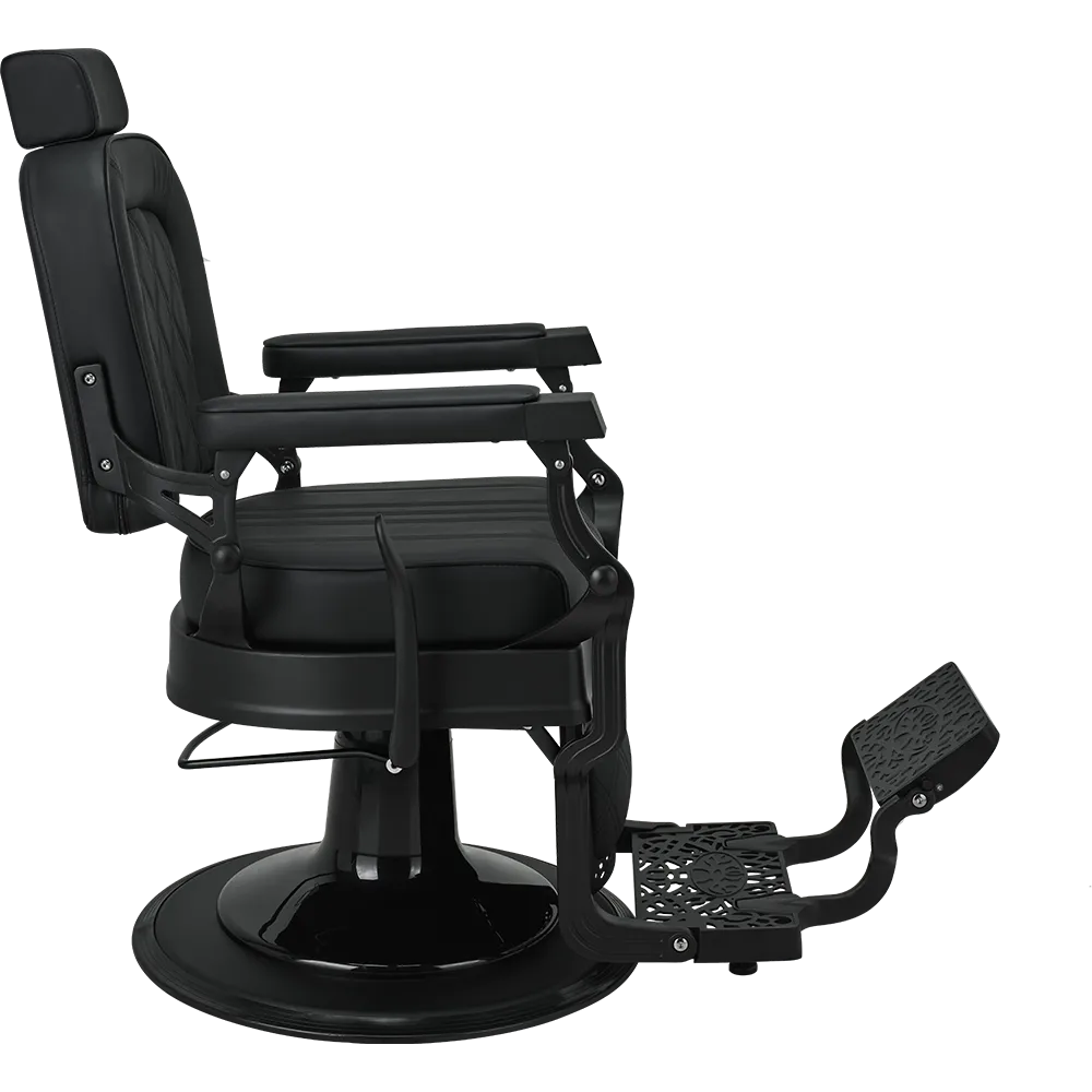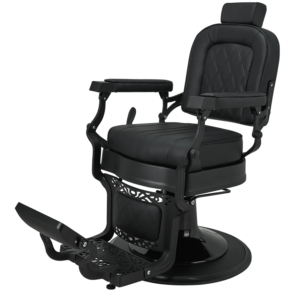 LOUIS barber chair Retro style with a modern twist. A solid metal frame with decorative detailing, black upholstery with quilted backrest and seat. The ergonomic backrest, adjustable headrest, and swiveled footrest provide maximum comfort for both work and client relaxation. An excellent choice for salons with character. Black upholstery