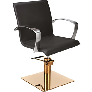 The PARTNER barber chair is a piece of furniture with a truly classic design. Its simple seat shape combined with elegantly curved silver aluminium armrests creates a refined and timeless look. Black upholstery