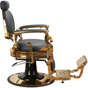 The golden frame and decorative footrest give the interior a unique character, while the reclining semilying position and built-in towel holder ensure maximum working comfort. Black upholstery