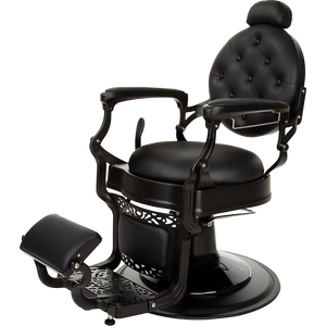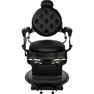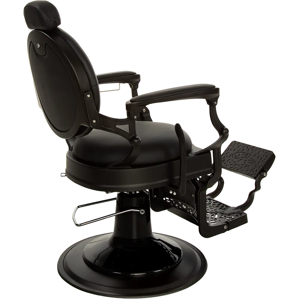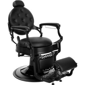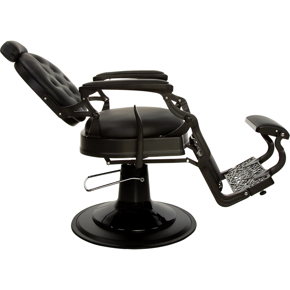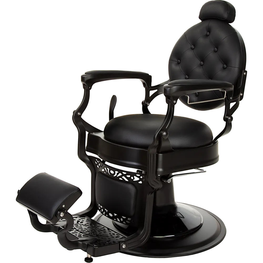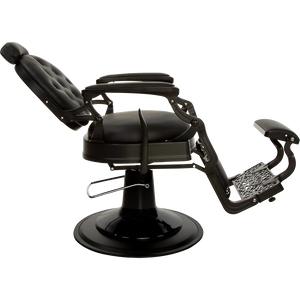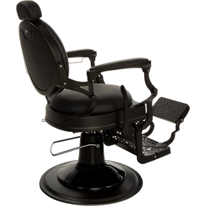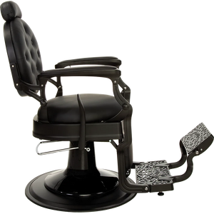 The dark satin metal frame, decorative footrest, and glossy black pump cover make it one of the most elegant barber chairs. Black upholstery