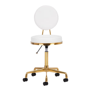 Ce tabouret doré et blanc possède une assise et un dossier confortables recouverts de cuir écologique. Il repose sur une base stable à cinq branches. Construit avec des pièces métalliques, il est durable et résistant aux dommages. La hauteur de l'assise est facilement réglable. Les roulettes en plastique permettent de changer facilement de position. L'assise est entièrement rotative.