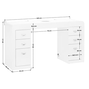 Les armoires des deux côtés avec trois tiroirs spacieux facilitent grandement l'organisation et le maintien de l'ordre des cosmétiques et outils les plus nécessaires. Grâce à cela, les produits nécessaires sont toujours à portée de main, ce qui se traduit par une efficacité du travail. Le bureau a des trous spéciaux dans le plateau pour faire passer les câbles des appareils nécessaires, ce qui permet de maintenir facilement l'ordre et l'esthétique du poste de travail.