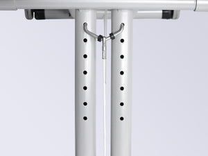 Le réglage en hauteur de la chaise permet d'ajuster la disposition de l'assise par rapport aux genouillères, en fonction de la structure corporelle du patient.