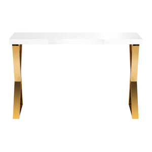 Le plateau blanc brillant et les pieds géométriques dorés lui confèrent légèreté et un caractère moderne. Grâce à sa forme légère, le bureau s'intègre aussi bien dans les intérieurs intimes que spacieux, soulignant leur caractère exclusif. C'est un excellent investissement dans l'esthétique et le confort du travail quotidien.