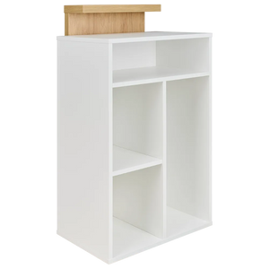 TINA is the most popular mini reception desk in our range, designed for hair and beauty salons. It’s simple, timeless form fits perfectly into Scandinavian interiors as well as more classic or modern spaces. This compact piece offers four practical open shelves to hold all essential accessories. Made of durable laminated board – available immediately in a white and dark wenge combination, and on order in any décor from our collection. Body made of white laminated board