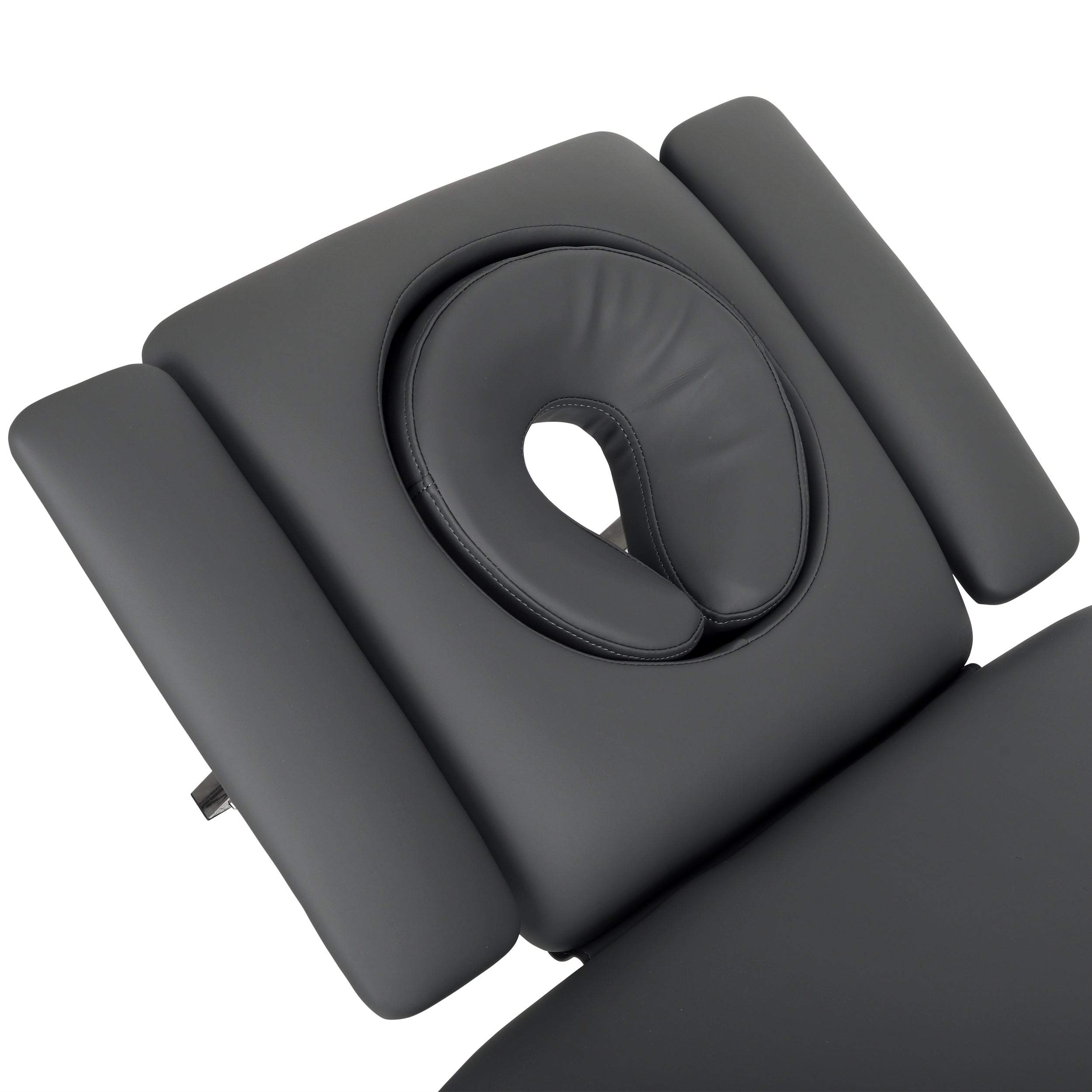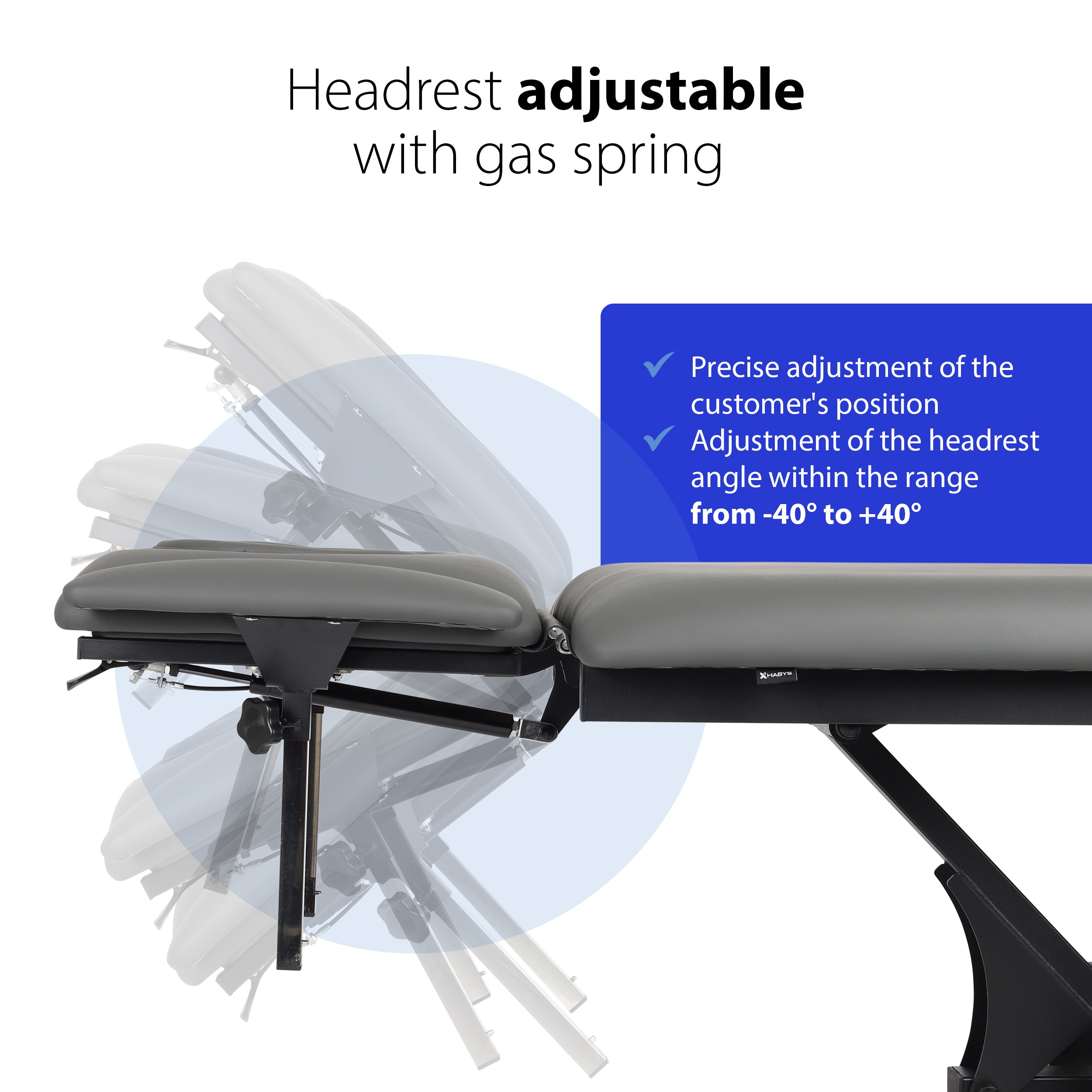 Appui-tête avec coussin ERGO : Le réglage de l'angle de l'appui-tête et le mécanisme à ressort à gaz assurent un réglage silencieux et précis de la position du patient en fonction des besoins de la thérapie. Le coussin Ergo, approprié, doux et confortable, spécialement profilé et adapté à l'ovale du visage, offre un excellent confort au patient, même pendant les longues séances de thérapie ou de massage.