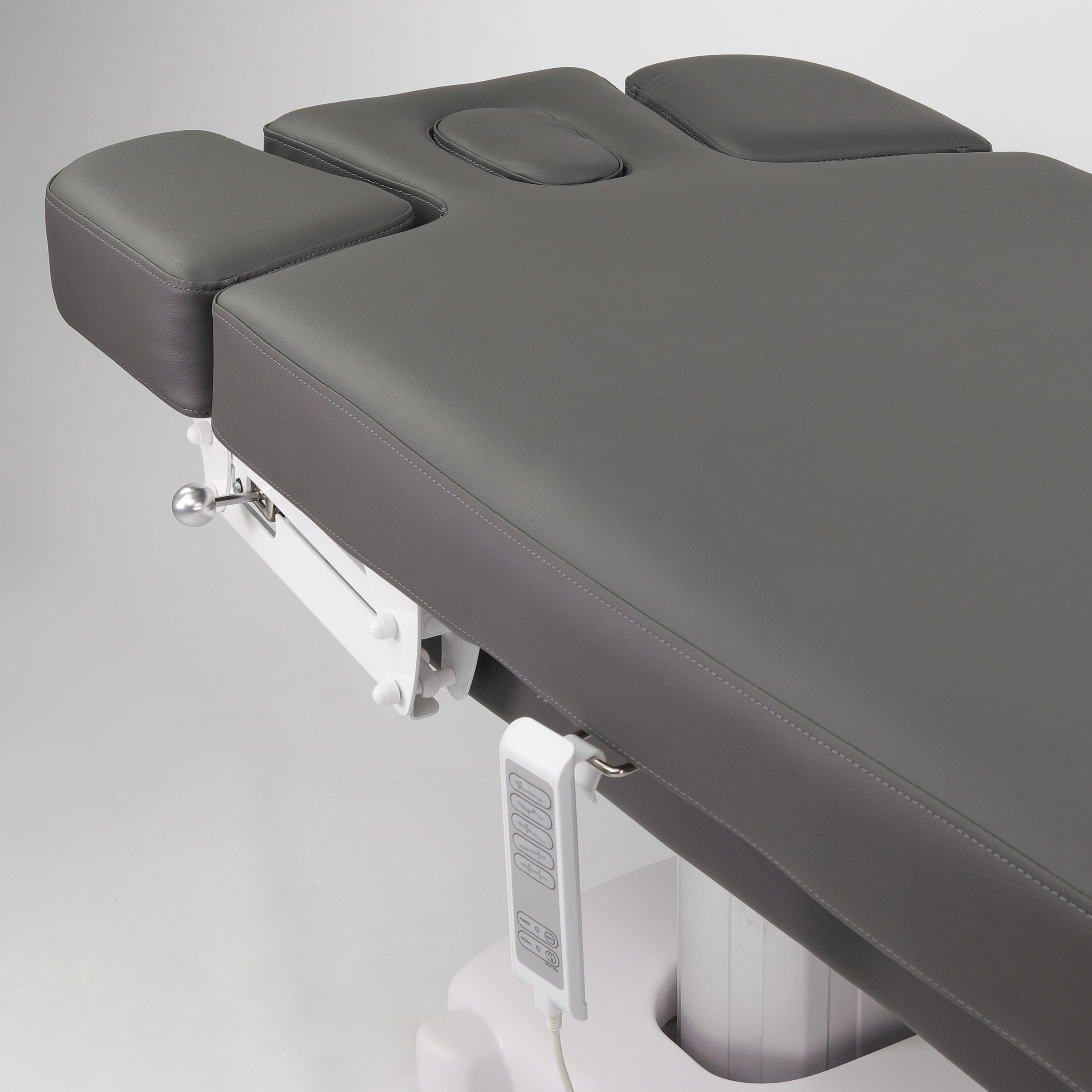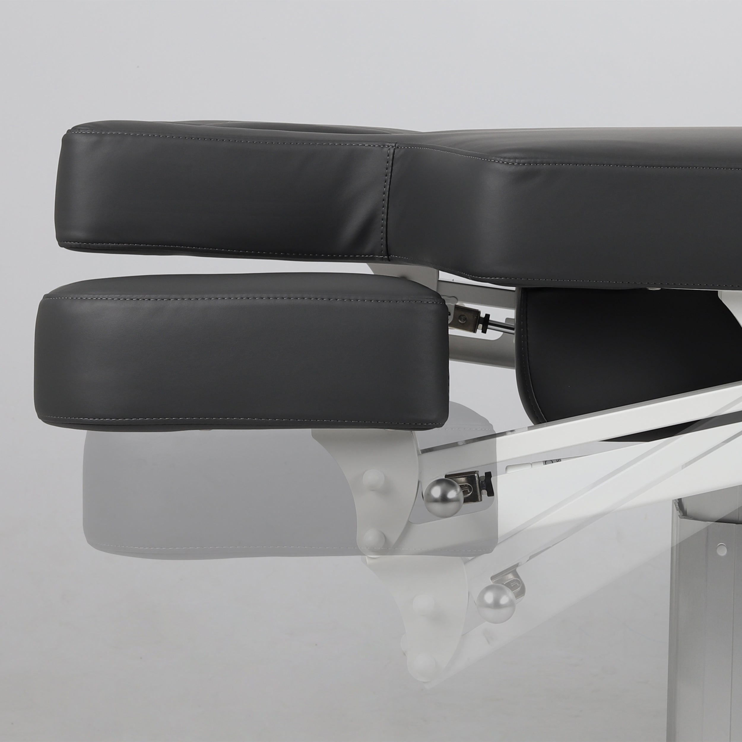 Le réglage en douceur des accoudoirs avec une large plage et un trou pour le visage dans la table vous permet d'ajuster une position confortable lorsque vous êtes allongé sur le ventre.