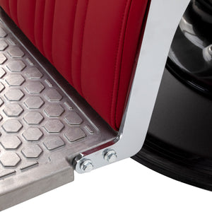 The stable base provides secure support and high comfort of use. The seat is filled with deformation-resistant foam and upholstered with semi-matt synthetic leather, guaranteeing durability and comfort for a long time. The materials are distinguished by their resistance to moisture and ease of cleaning. The burgundy upholstery combined with metal chrome elements and a decorative footrest give the chair a distinctive, classic character. Vertical stitching emphasises the vintage style, which fits perfectly into the atmosphere of professional barbershops. Carefully refined details give the whole a representative look, and the functional design promotes comfortable and effective work.