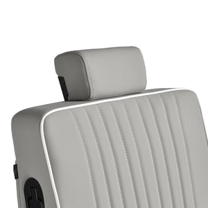 The black, round base ensures stability and durability. The soft, matte synthetic leather upholstery combines comfort with durability. The materials used are moisture-resistant, durable and easy to clean. Stylish stitching and grey-toned upholstery give it a unique character, perfectly complementing the décor of modern barbershops. The combination of the elegant upholstery colour with the black frame and base emphasises the modern, professional look of the chair.