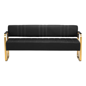 La large assise recouverte de cuir synthétique dans les tons noirs offre un confort pour un maximum de trois personnes, permettant d'attendre confortablement le soin. La forme minimaliste, les éléments dans les tons dorés et les surpiqûres élégantes soulignent son caractère exclusif. Le canapé Avila est un excellent choix qui soulignera le prestige de votre salon, tout en offrant confort et durabilité pour les années à venir.