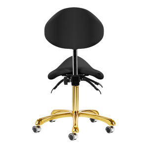 La base à cinq branches, correctement conçue dans des tons dorés, rend le tabouret stable, même pendant un travail intensif. Les roulettes assurent une mobilité importante, ce qui facilite le déplacement du meuble dans le cabinet. Le revêtement du tabouret durable est en simili cuir dans des tons noirs. Grâce à l'utilisation de ce matériau, le tabouret est résistant à l'humidité et facile à nettoyer.