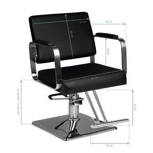 Fauteuil de coiffure moderne de la marque HAIR SYSTEM. Élégant et très confortable. Une base chromée solide garantit la stabilité du siège. Revêtement en similicuir noir de haute qualité. Le fauteuil est réglable en hauteur.
