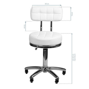 Tabouret de cosmétologie de couleur blanche avec assise matelassée et dossier confortable. Il possède un réglage de la hauteur et une base à cinq branches équipée de roulettes robustes en métal et caoutchouc.